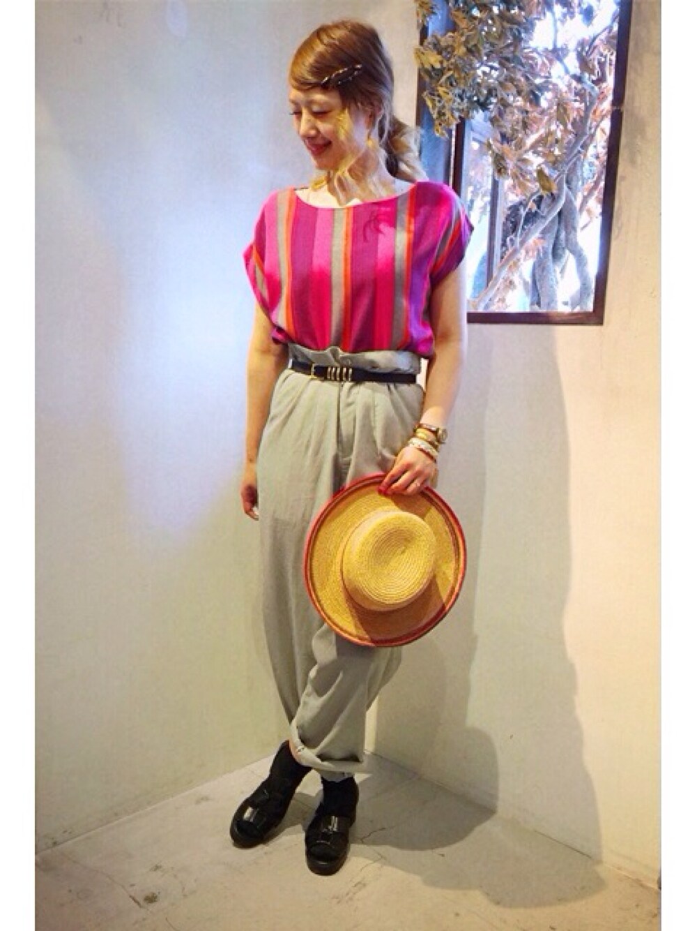 パキッと明るいピンクのカットソーにグレーパンツを合わせた大人ヴィンテージスタイル🌟💓🌟💓ベルトでギャザーを作ればいつものパンツとは違った雰囲気も出ておすすめです🐰👍✨