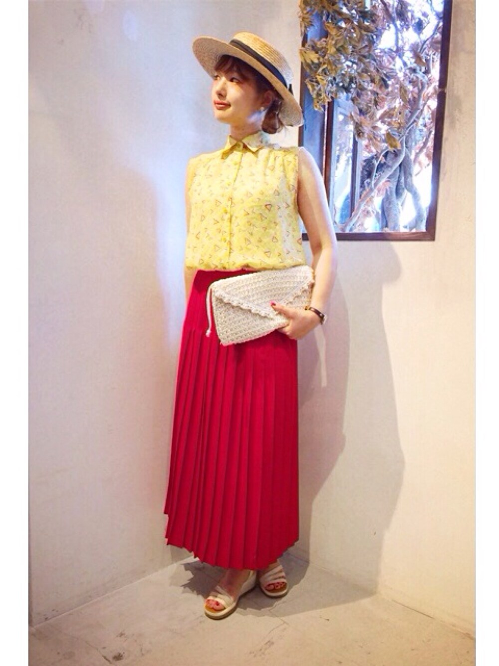 赤スカートで作る夏コーデ♪ 赤のプリーツスカートに黄色で味付け♬ノースリーブブラウスはとっても涼しくてこの時期におすすめです!!! ヘアーも、まとめるとスッキリします* コーディネートに困ったらお気軽に聴いてくださいね♬
