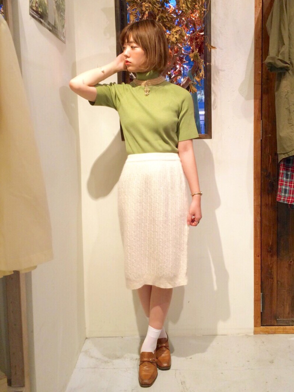 こんばんは🌼原宿店staffまほです🐻 本日のコーディネートをご紹介します! * 《🌲若草色のアンティークコーデ🌲》 * 全体をペールトーンでまとめて、トップススカート共にニット素材にしました🐑◎ * パールの付け襟で華やかさUPです✨✨