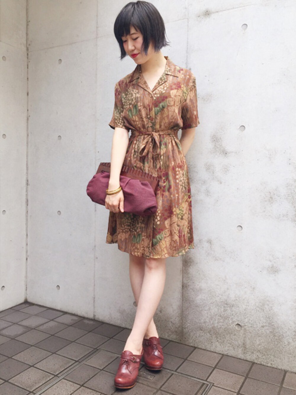 古着屋RAINBOWのワンピース「古着 茶 プリント 前開き 半袖 膝丈 ワンピース レディース ヴィンテージ (古着屋RAINBOW) (otu1608379)」を使ったコーディネート