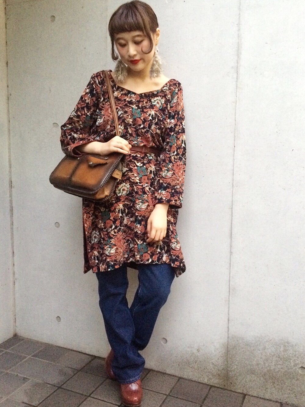 古着屋RAINBOWのワンピース「古着 茶 花柄 コーデュロイ 長袖 膝丈 ワンピース レディース ヴィンテージ (古着屋RAINBOW) (otu1608495)」を使ったコーディネート