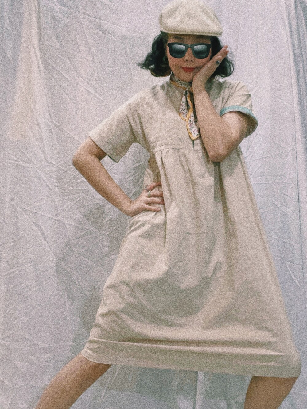 ベージュ系のシャツワンピース、ホワイト系のハンチング/ベレー帽を着用したレディースの夏コーディネートの1枚目の写真