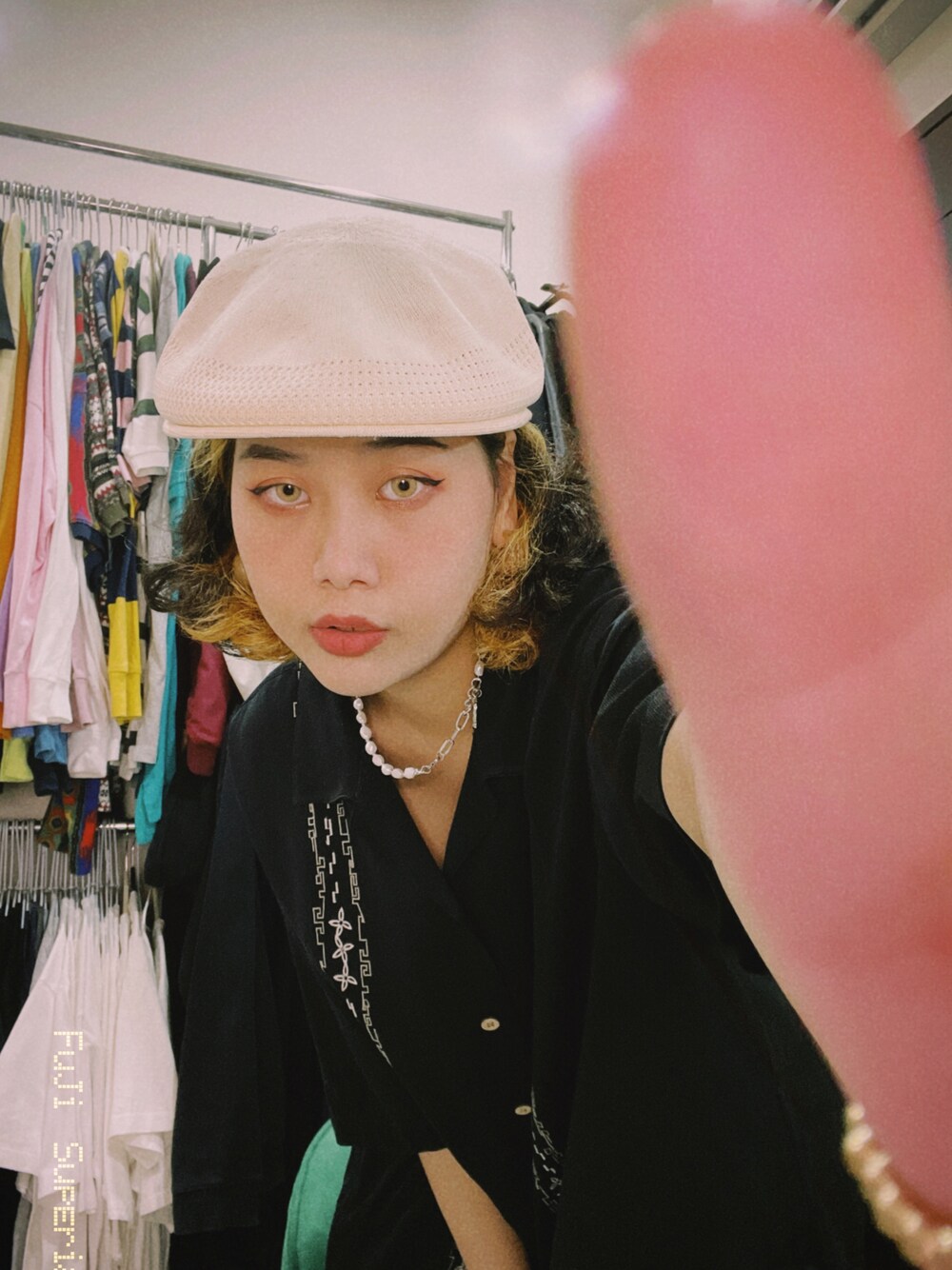 ブラック系のシャツ/ブラウス、ホワイト系のキャップを着用したレディースの夏コーディネートの1枚目の写真