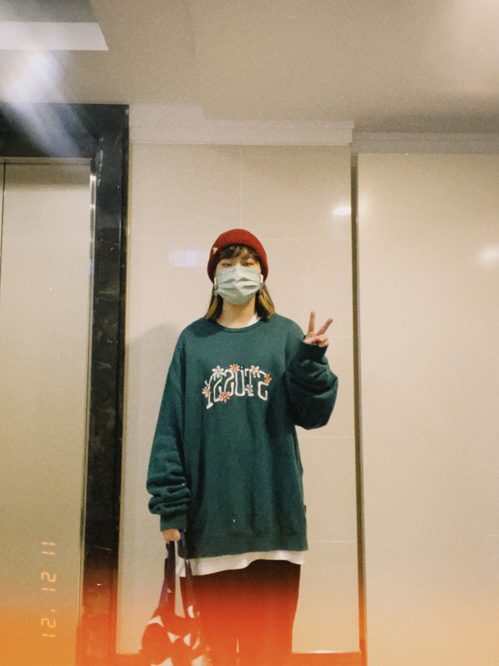 グリーン系のトップス、レッド系のキャップを着用したレディースの秋コーディネートの1枚目の写真