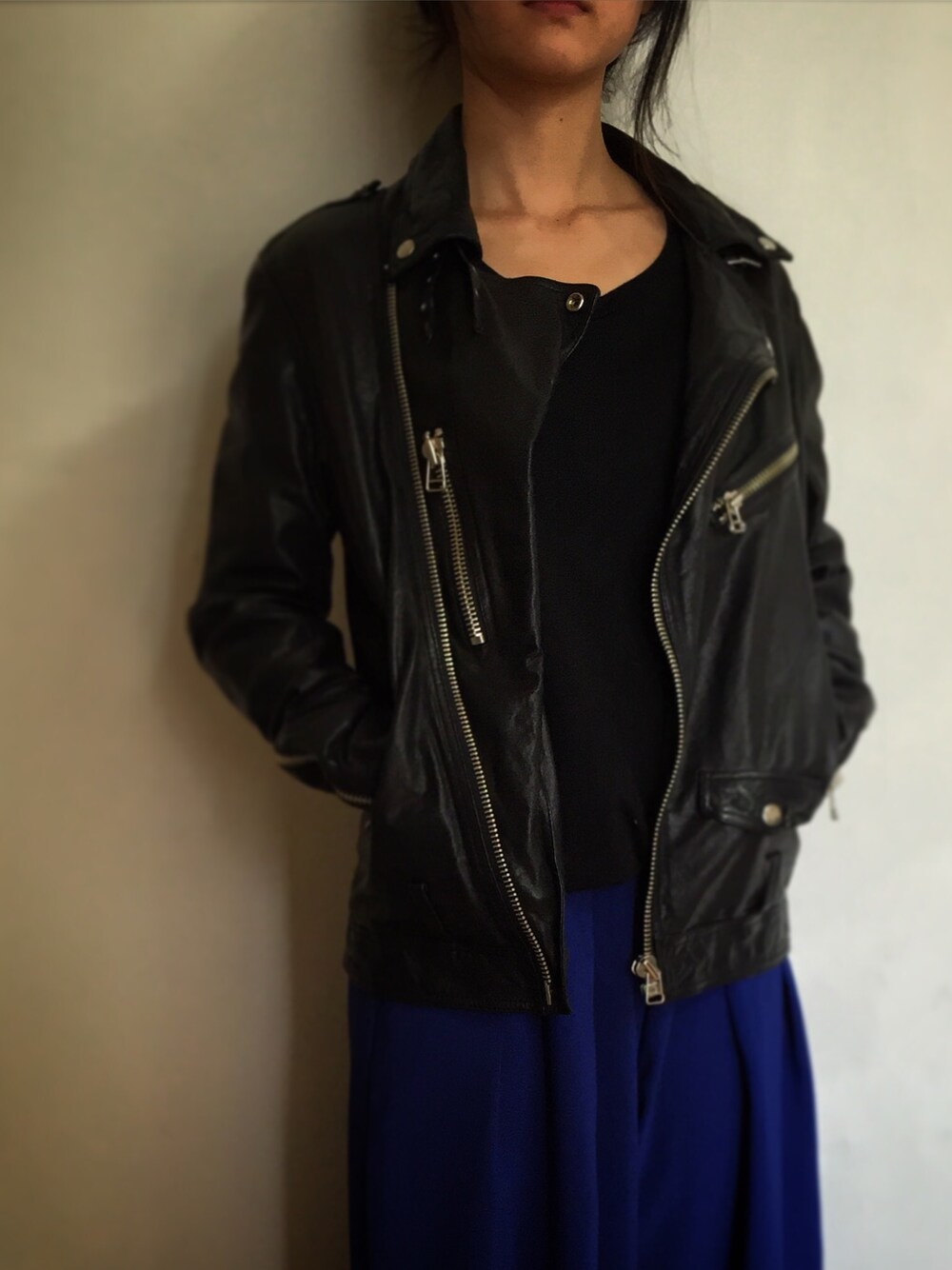 ブラックとブルーのコーデです。ハードなレザーアウターとソフトなパンツをmix&matchして見ました。