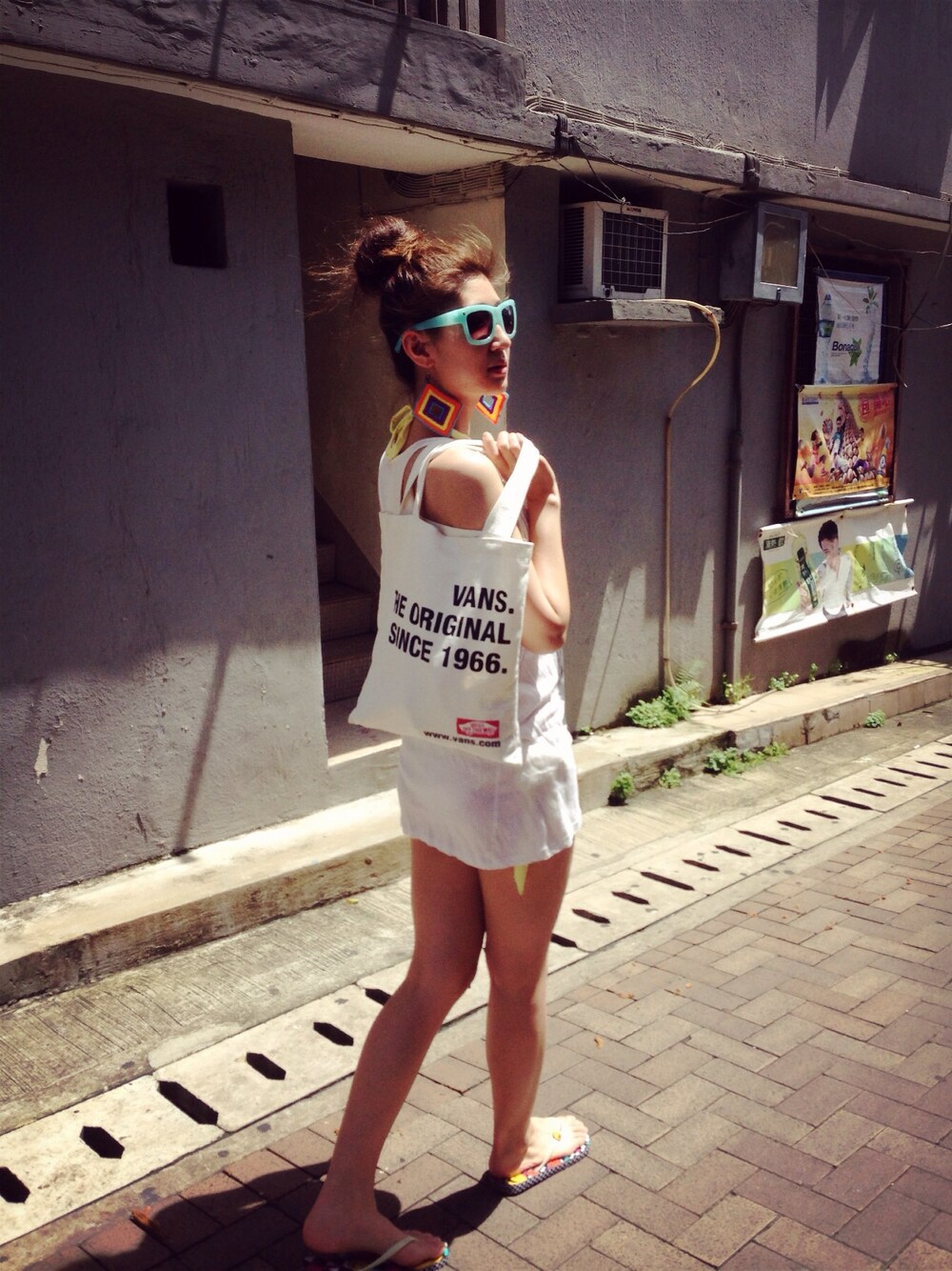 ホワイト系のベスト、ホワイト系のトートバッグ、グリーン系のメガネを着用したレディースの夏コーディネートの1枚目の写真
