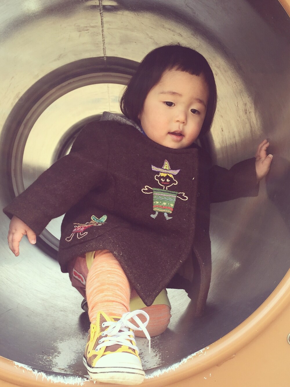 おかっぱちゃん boyですよ。 古着のコート。 ハンドメイドっぽくて、手刺繍な 刺繍の絵柄と形とたまらないけど、 着心地は良くなさそうで、あまり着せてない。