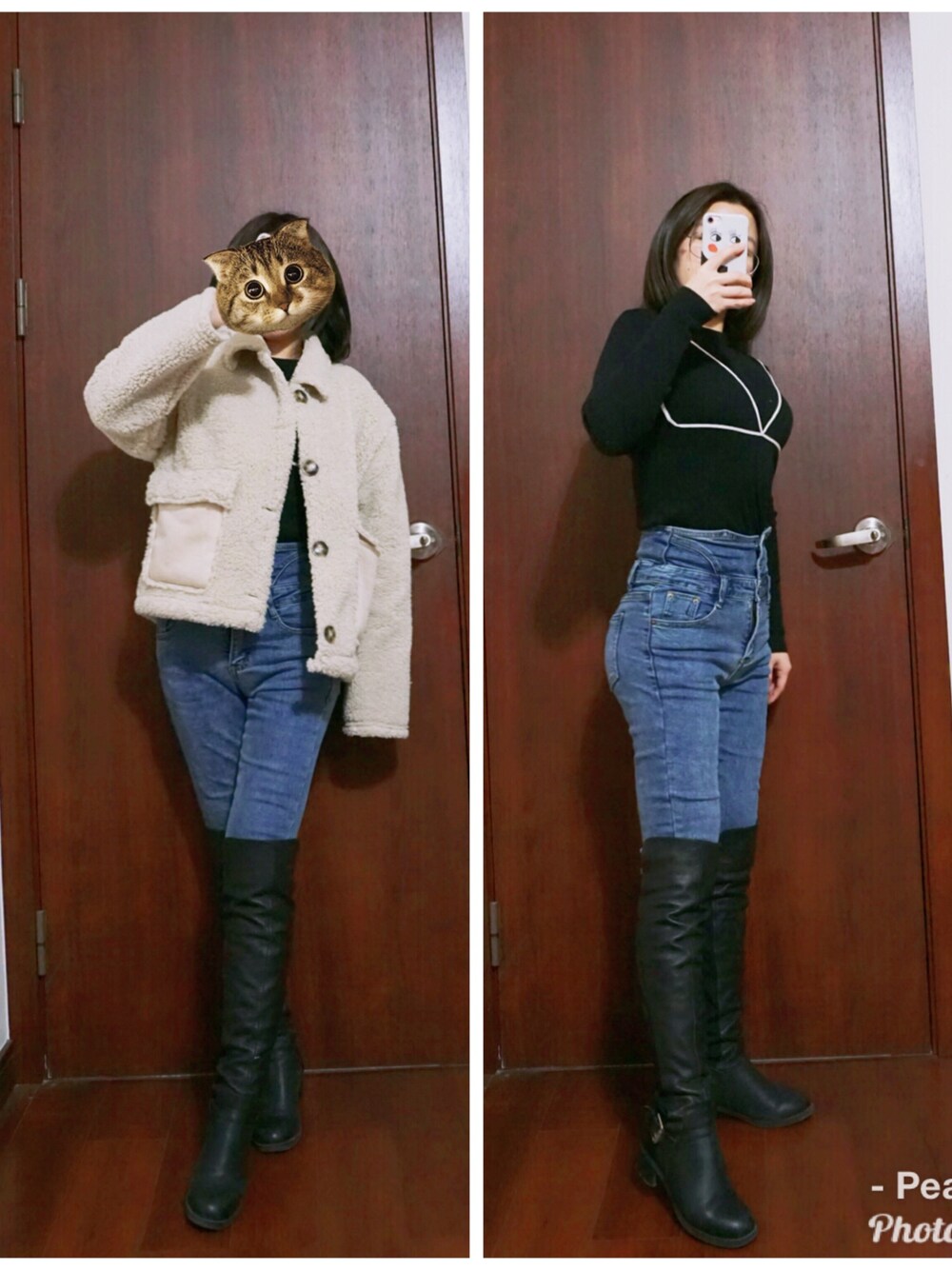 这个内搭很chic,配上高腰牛仔裤+过膝靴