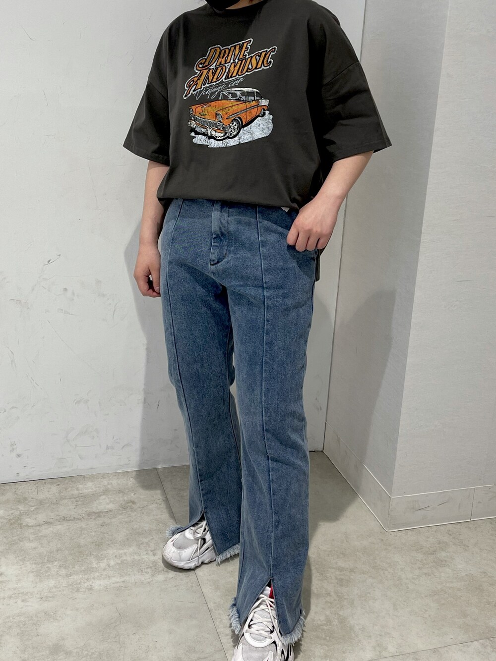 メンズのスリット入りデニムフレアパンツ可愛すぎる🤍 スタイル良く見えるからおすすめ 古着風プリントTシャツとの相性抜群🎯