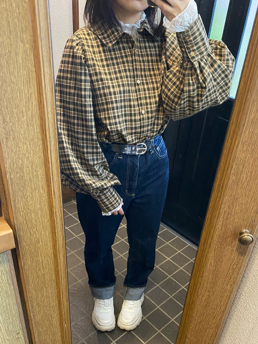 昨日のチェック柄の着回しだい パンツにしたけどデニムのミニスカートでも可愛いなって思ってる