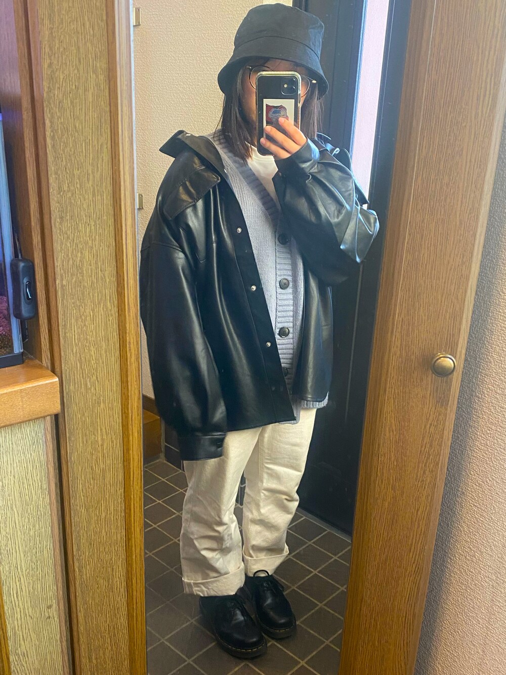 来世はパンダのブルゾン「フェイクレザーシャツビッグジャケット」を使ったコーディネート
