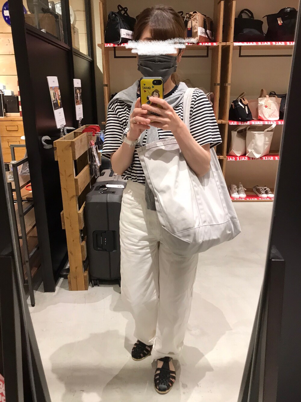UNIQLO Uのホワイトデニム、形も好きだし動きやすい☆ 無印のボーダー、ゆとりあって着心地よし。肩掛けカーデでよそ行き感プラスで☆ 久しぶりのお買い物で楽しかった!