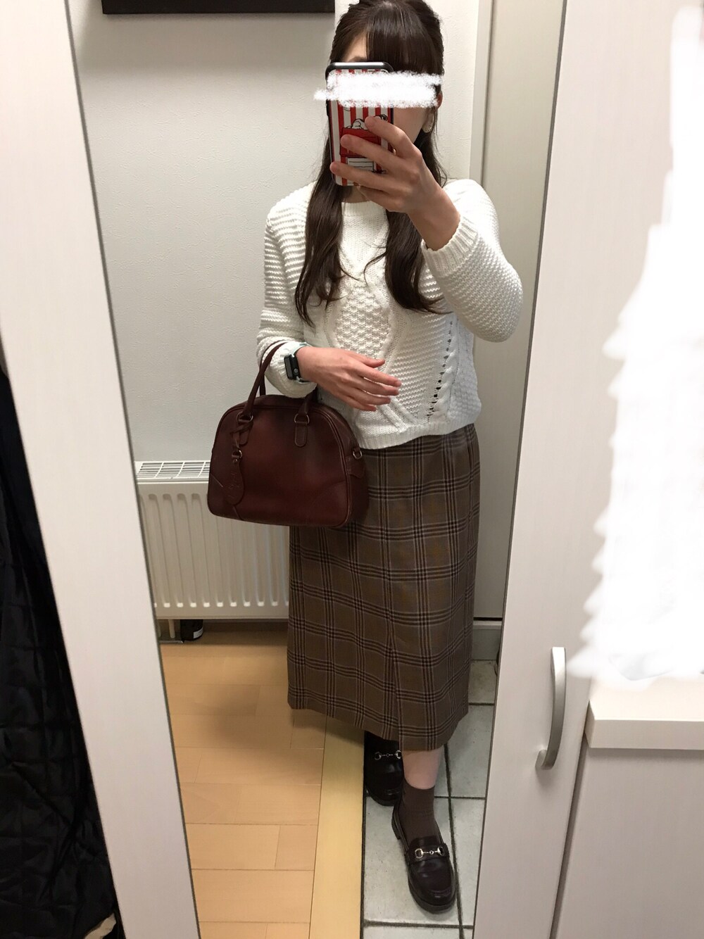 H&Mのニットショート丈だからスカートに合う☆ ブラウン&ホワイトコーデ タイヤ交換へ行ってきた