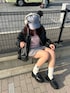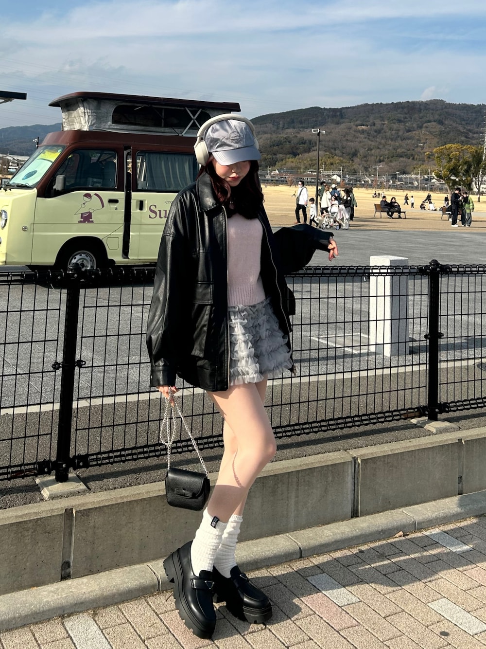 甘々コーデに、レザージャケット、キャップ、ヘッドホンをプラスでカジュアルテイストに^^🎶