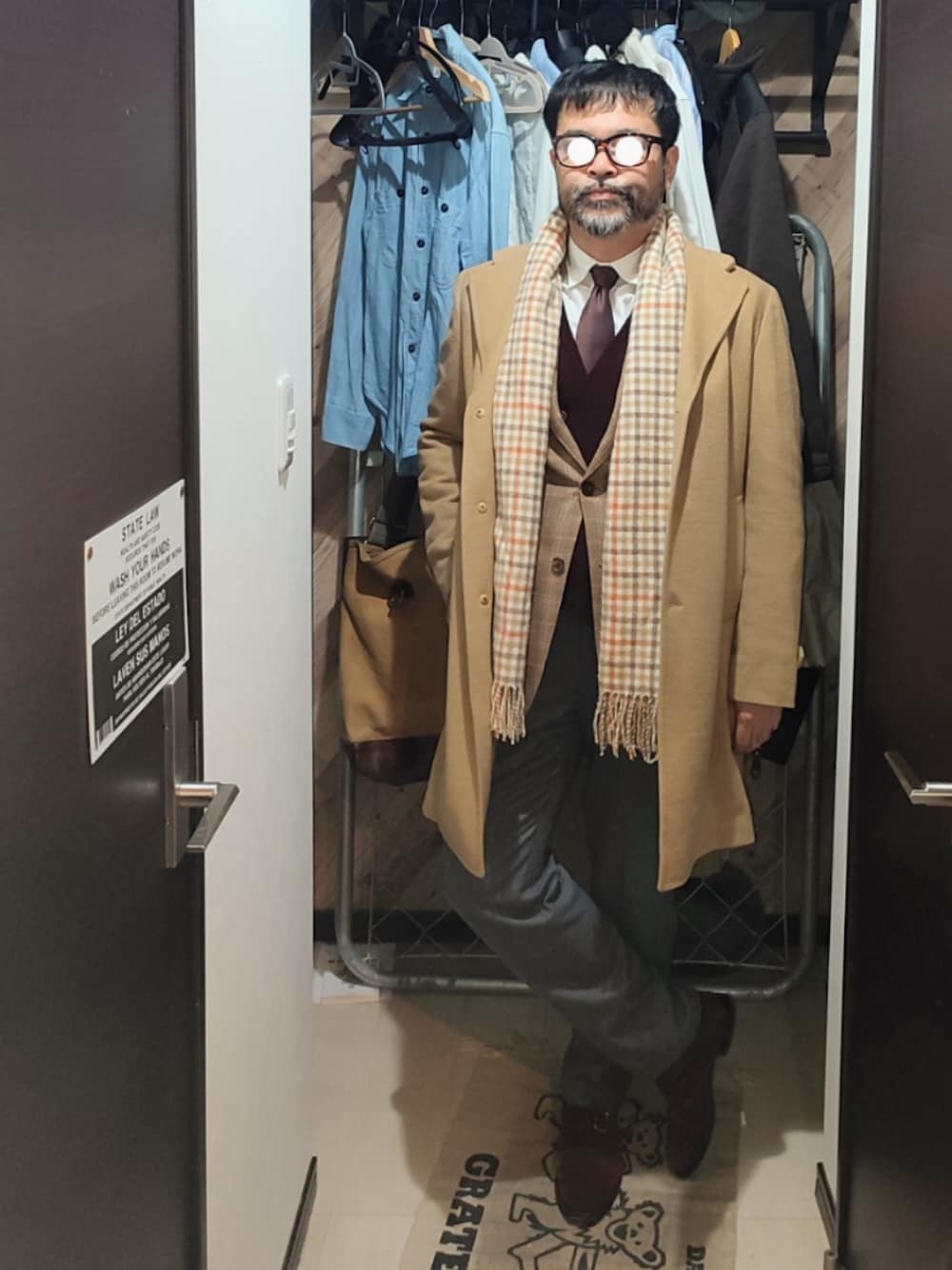 ブリティッシュイメージの本格ジャケパンスタイル ある程度フォーマルが必要な日だったので、細身のスラックスでジャケパン。 ベージュ〜ブラウンの同系色で統一。 ジャケットのラインのオレンジはマフラーで拾う。