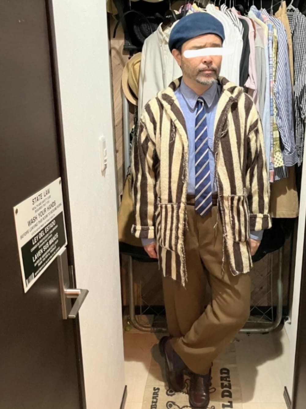 変形ジャケパンスタイル ジャケット代わりに羽織タイプのブラウンストライプのメキパを羽織る。 色合わせはアズーロ・エ・マローネで、上半身下半身ともに青と茶を散らした。