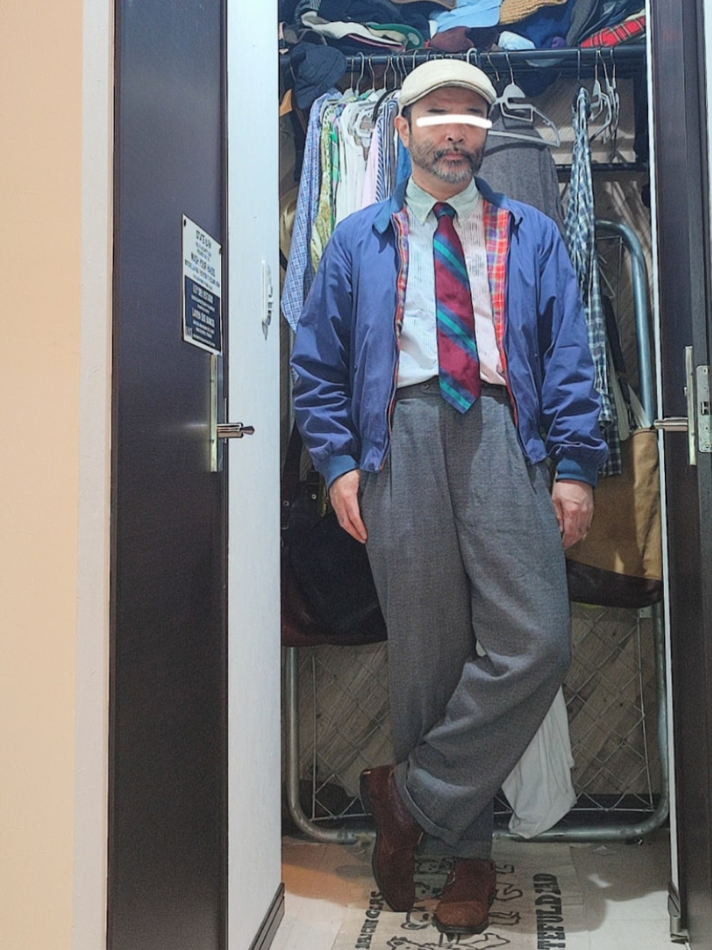 紺ブレ代わりのG9 裏地のチェックに合わせて、青赤緑でシャツとタイも合わせる。 靴はスウェードで秋らしさを演出。