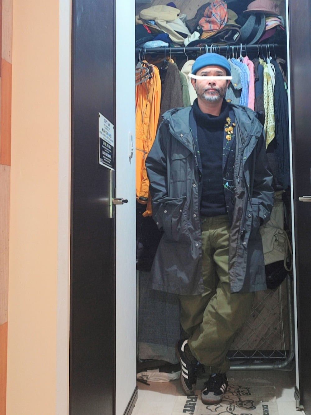 名古屋の古着屋で購入したペンキ加工の古着ジャケットから組み立て。 ペンキの色に合わせて、ブラックベースにブルーとグリーンで。