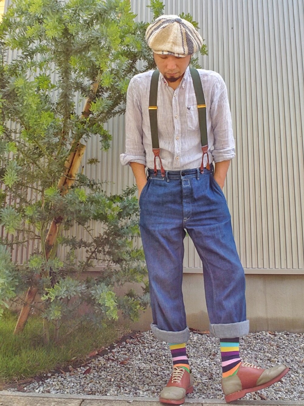 リネンのヒッコリーシャツに サスペンダーとデニムで ワークスタイル カラフル靴下を添えて 田舎っぽいのをイメージしたのに 田舎を歩いてると浮きます