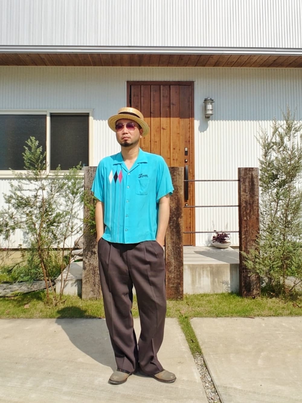 50`sのボーリングシャツに 太めのスラックスとカンカン帽で チンピラを演出