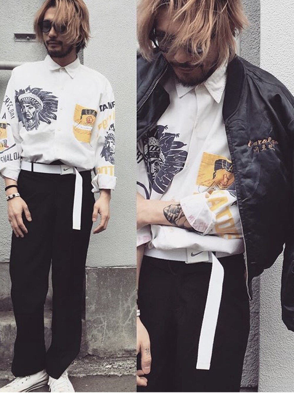 ホワイト系のシャツ/ブラウス、ブラック系のその他アウターを着用したメンズの春コーディネートの1枚目の写真