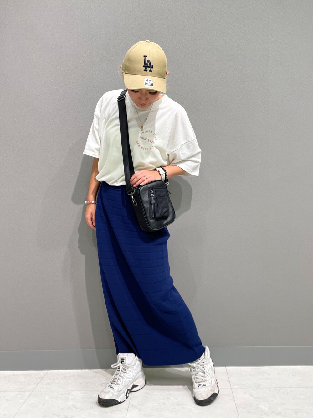 キレイめコーディネート✨️ 定番のヴァーシティTEEに 新作入荷のパネルボーダーニットスカートを 合わせてみました〜💙 Tシャツをinすることにより脚長効果になりスタイル良く見えます👗 スニーカー👟サンダル👡どちらとも相性抜群‼️ ちなみにナイロンコンビレザーBAGも新作なのでチェックしてみて下さい✓