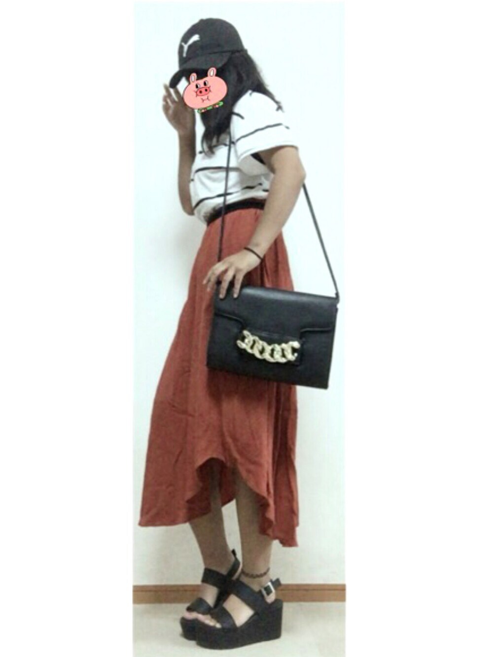 キャップ→PUMA ¥999 Tシャツ→ZARA ¥200 スカート→H&M ¥500 シューズ→メルカリ ¥1000 バッグ→H&M ¥500 合計 ¥3199🙆