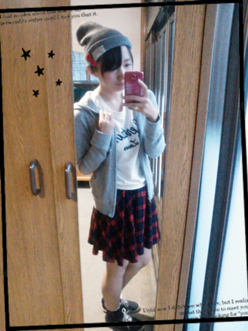 このトップス、シフォンの袖がめちゃめちゃカワイイんですが… さすがに寒くてパーカー着ちゃいました(´△`) 帽子と靴下に付けた赤リボンがポイントです♡笑