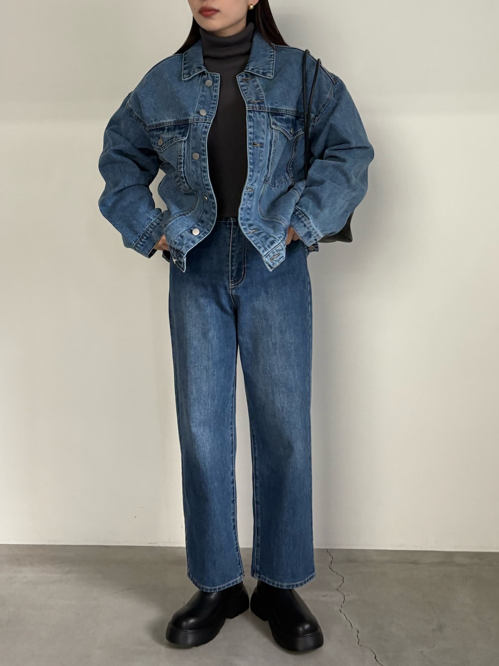 161cm / 骨格ウェーブ 春になったらしたくなるデニムonデニム👖 まだ寒いからタートルニットをインナーに。 デニムジャケットは今季Sサイズが登場! コンパクトめに着たい方にはSおすすめ🤍