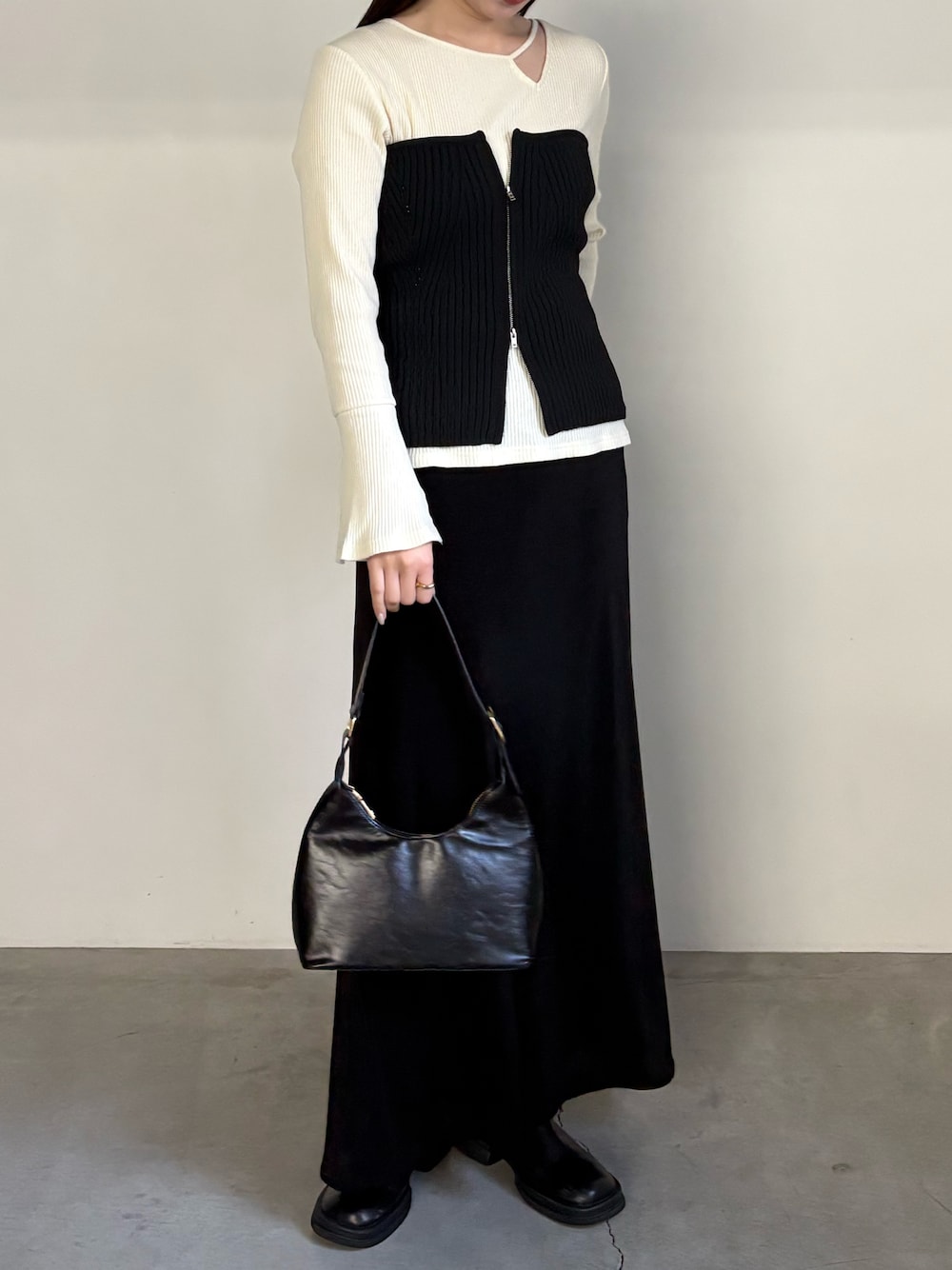 ran(MOCA office)のベスト「ジッパーリブニットビスチェ」を使ったコーディネート