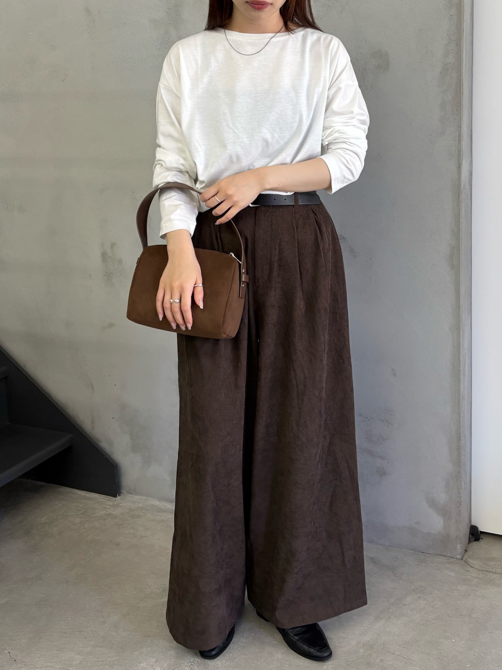 161cm / 骨格ウェーブ 一気に秋の雰囲気を出してくれるコーデュロイパンツ。Tシャツと合わせてカジュアルスタイルに◎ 今年はブラウンがマストだね🤎