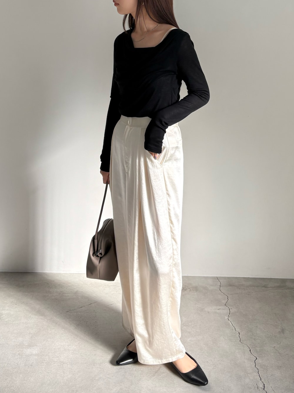 161cm / 骨格ウェーブ 骨格ウェーブにおすすめしたいドレープデザイントップス。 サテンパンツと合わせてよりきれいめに。 デートにもぴったりなアイテムです◎