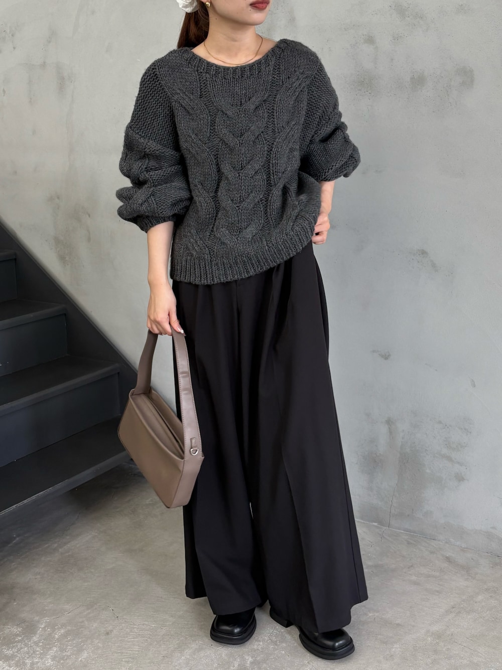 161cm / 骨格ウェーブ お袖のボリューム感がたまらなく可愛いケーブルニット🧶カジュアルなケーブルニットも鎖骨が見えるネックラインで、女性らしく見せてくれるのもポイント!!