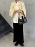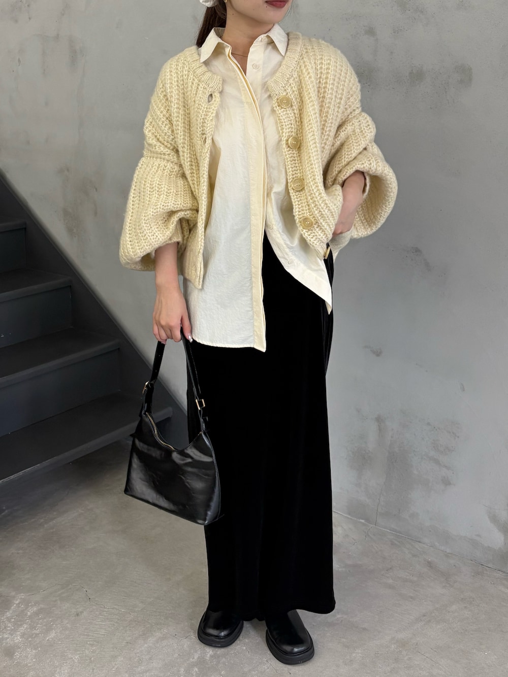 161cm / 骨格ウェーブ ざっくりとしたローゲージニットとボリューム感が可愛いカーディガン🐏 シャツとレイヤードして今年っぽく。 カーディガンが腰丈なのでシャツをレイヤードすることで気になる腰回りもカバーしてくれます◎