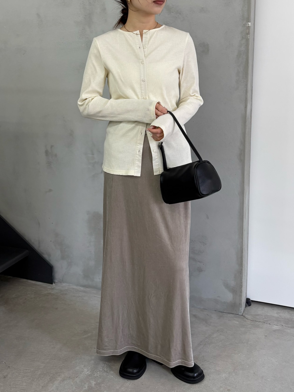161cm / 骨格ウェーブ 春トップスでマストバイしたいリブトップス。 上下のボタンを開けて抜け感を出したスタイリングがおすすめ◎