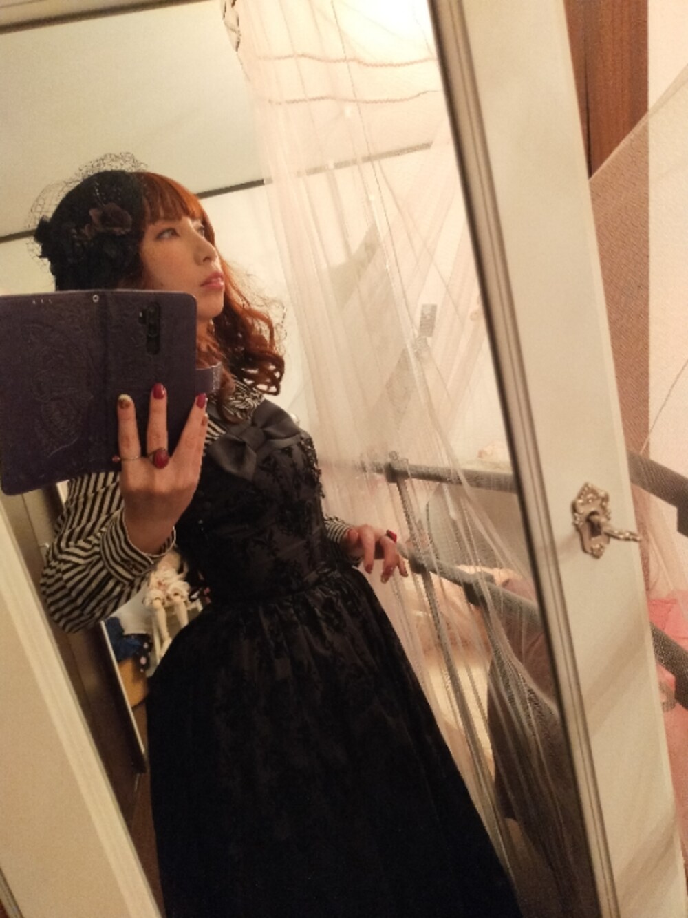 黒多めのコーデにしました。赤系のウィッグで華やかさをプラスしました。