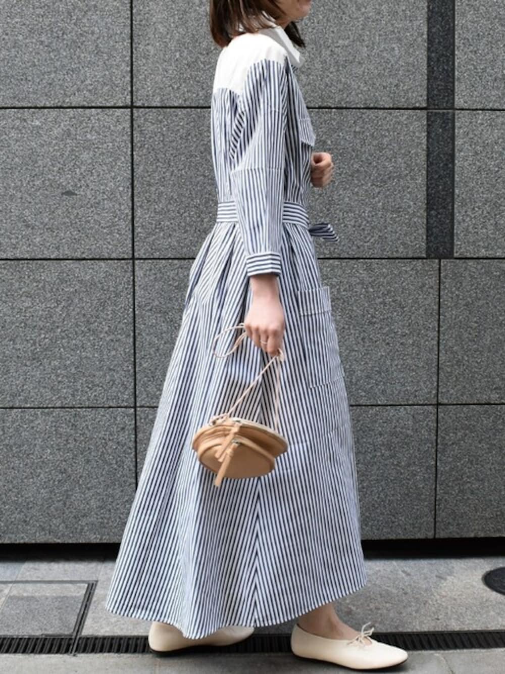 ブルーストライプと肩の白無地切替の組み合わせが夏らしいシャツワンピース♪