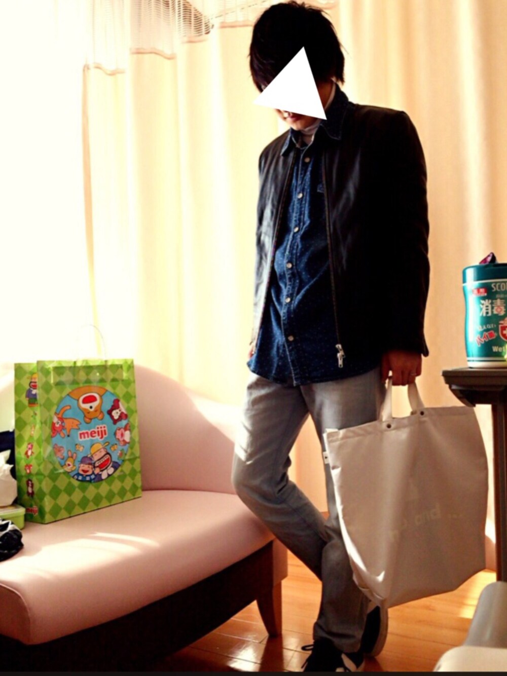 白のタートルネックの上に水玉のデニムシャツを着てキッチリしたレザーをゆるくしました。 なぜか今年ゆきが全く積もらない⛄️