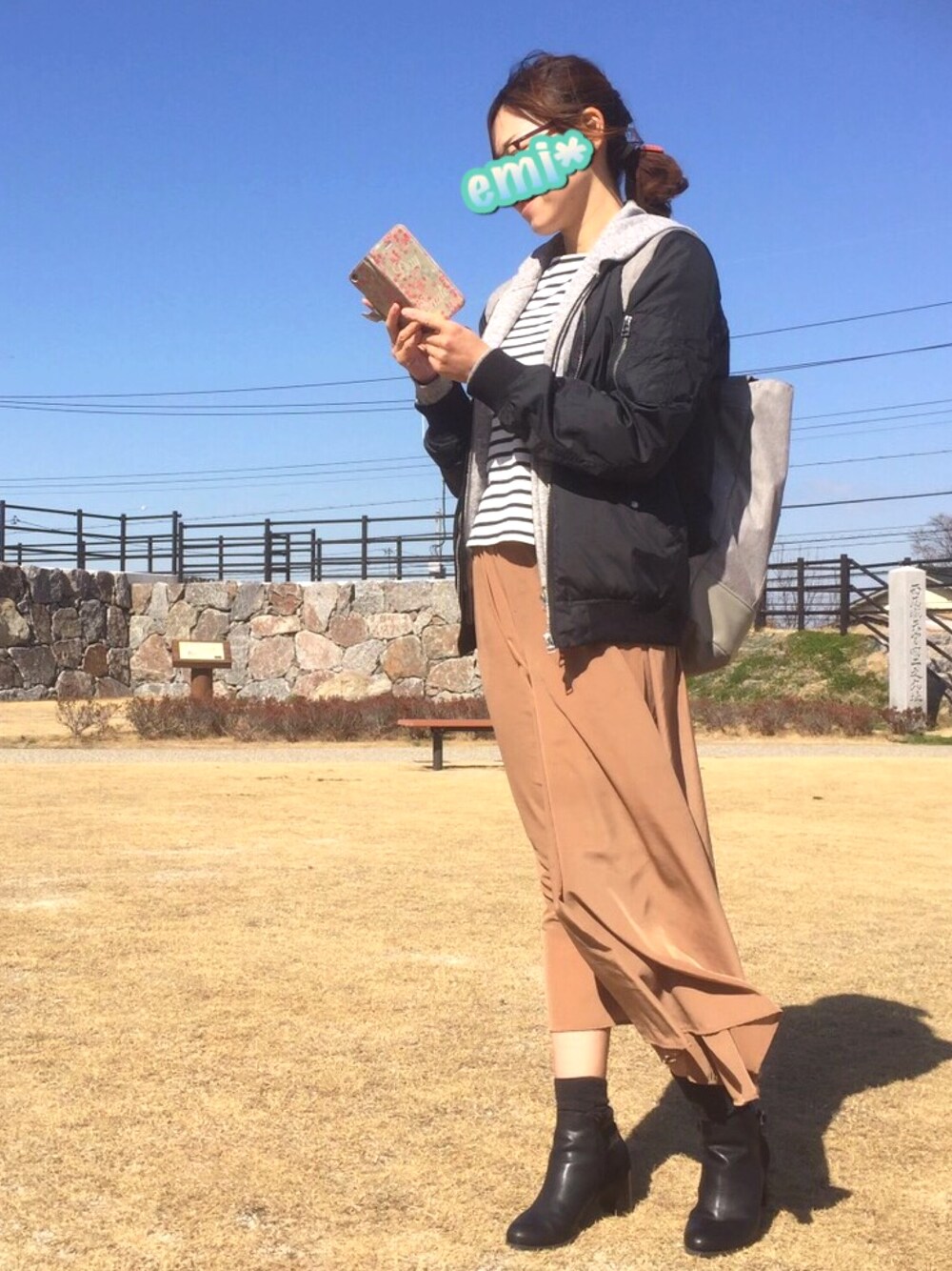 外へおでかけ🌼ということで今日は旦那のMa-1をかりて大人カジュアルに決めてみました(o^^o) そして日本庭園を見ながらゆっくりとお茶を飲むと聞いてたのでブーツで品を出そうと思って履いて行ったら、なんと山を登ることに(゚д゚lll)🍃 ブーツを気にするあまり足パンパンやわ〰