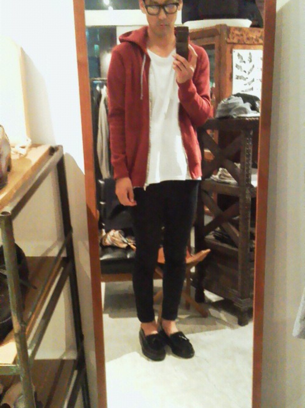 ・赤パーカー フィルメランジェ ・くつ ハルタ×エンダースキーマ
