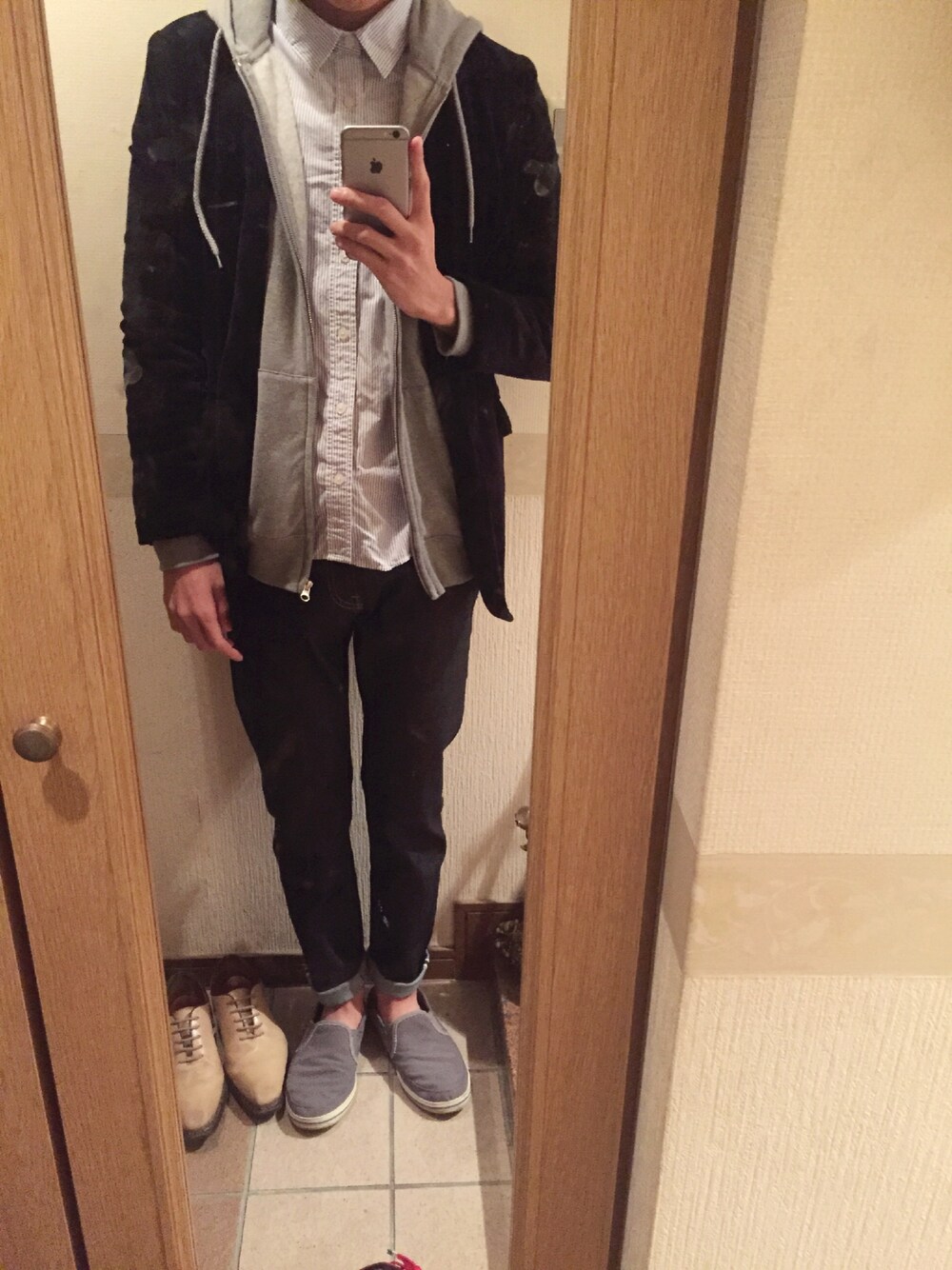 上 シャツ パーカー(WEGO) ジャケット 下 デニム(UNIQLO) デニムとかスニーカー履いてるけど、シャツが縦ストライプで、ジャケット羽織ってるからちょうど良いドレス感出てると思う。 このWEGOで買ったパーカー、安い割に安っぽく見えない。生地が厚いからかな? デニムはセルビッジとか言う奴。色味も凄い好き。よく分からんけどセルビッジはそういう加工の名前なのか?