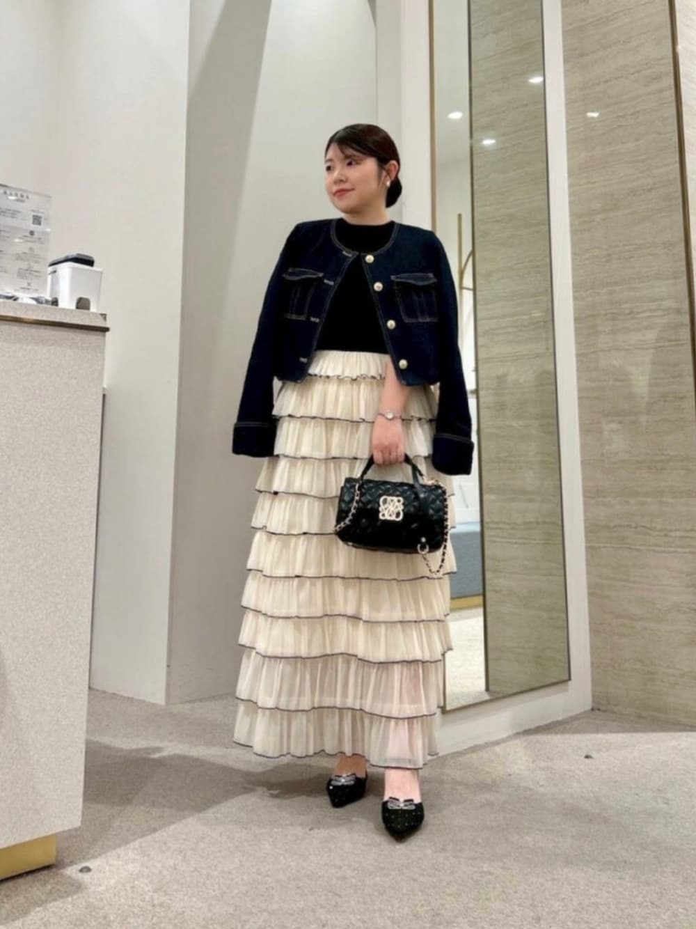 【ワンピース】 すっきり見えするリブニットとフリルスカートで メリハリのあるワンピース🌼 ジャケットやカーディガンとの相性も良いです! 【ジャケット】 クロップド丈でワンピースと合わせても バランス良くスタイルアップして見えます🎶 【シューズ】 ミニリボンとストーンで大人可愛いパンプス🖤 ストラップで安定感あり歩きやすいです! 【バッグ】 モノグラムのビジューが目を惹くショルダーバッグ✨ 普段使いだけでなくパーティーシーンにもオススメです!