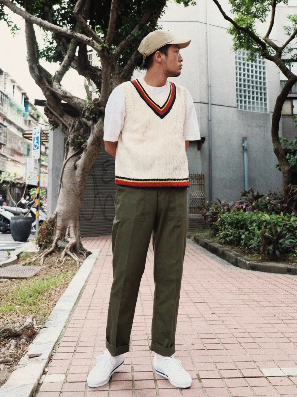 ベージュ系のニット/セーターを着用したメンズの夏コーディネートの1枚目の写真