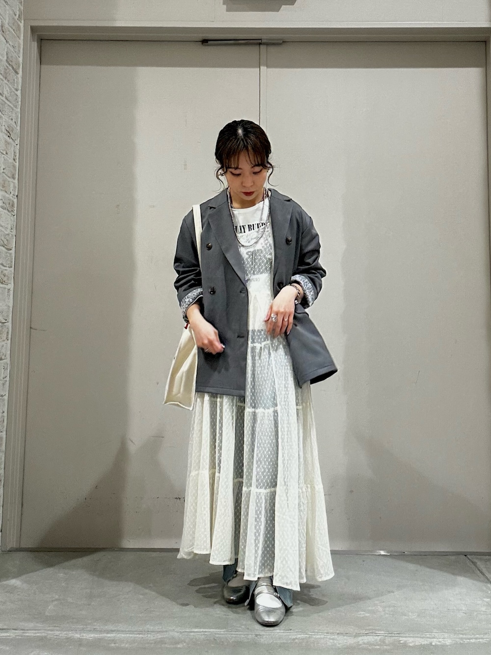 グレーのジャケットとレースワンピで春らしく! ジャケットは袖を折るとレースが見えるのが可愛いです!