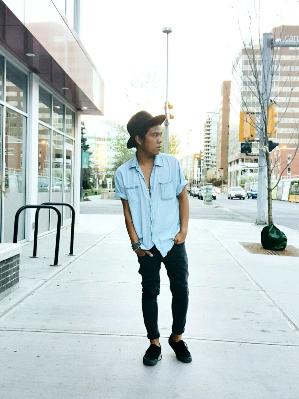 kept it simple with this summer look. Paired a light washed, worn out denim shirt I found in a vintage shop with a gray spray on skinny jeans from Topman and finished it with a hat from H&M's Coachella collection.