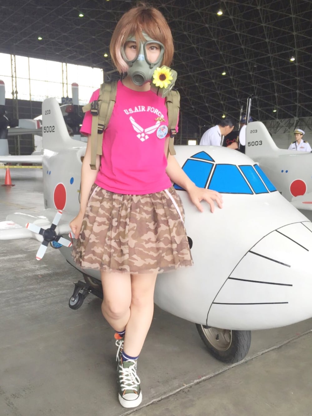 自衛隊サマーフェスタでミリタリー大好きアピールコーデ(^ω^) 海上自衛隊、下総航空基地にて。 海上自衛隊だけど、P-3Cという固定翼機の基地のため、悩んだ挙句Tシャツはエアフォースにしました(°_°) 自衛隊のイベントへ行くときはスニーカー、動きやすい服装がオススメです! (階段登ったり、地面に座ったりするため。) 今回のコーデはスカートですが、下に見えてもいいショートパンツをはいています! 胸につけた缶バッヂは下総サマーフェスタ限定缶バッヂ。 徽章は通称ドルフィンマークこと潜水艦徽章。 Tシャツは米軍基地で買ったもの。 スニーカーはコンバース。シガーポケット付きのミリタリー感満載のもの。 バッグは新宿のミリタリーショップ TAYLOR&STONERさんからかっさらった、英軍特殊部隊御用達のkarrimorのバッグ。お気に入り!