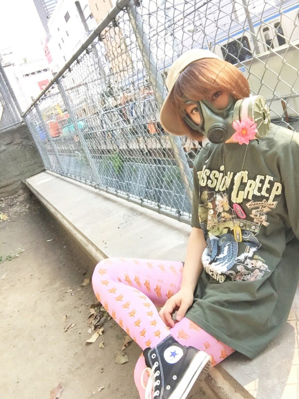 スケボー、バトミントンをするときの公園コーデ♪( ´θ`)ノ Tシャツは福岡のミリタリーショップSWATさんで購入!ラットフィンクぽい兵士のイラストがかわゆす!LサイズなのでデカTとして着ています。 タイツはキツネ柄!コンコンコンコン!