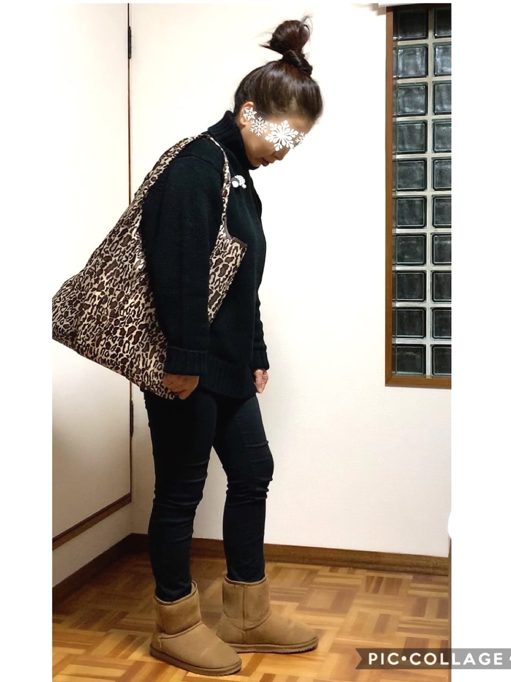 ブラック系のニット/セーター、その他のトートバッグ、ブラック系のデニムパンツを着用したレディースの冬コーディネートの1枚目の写真