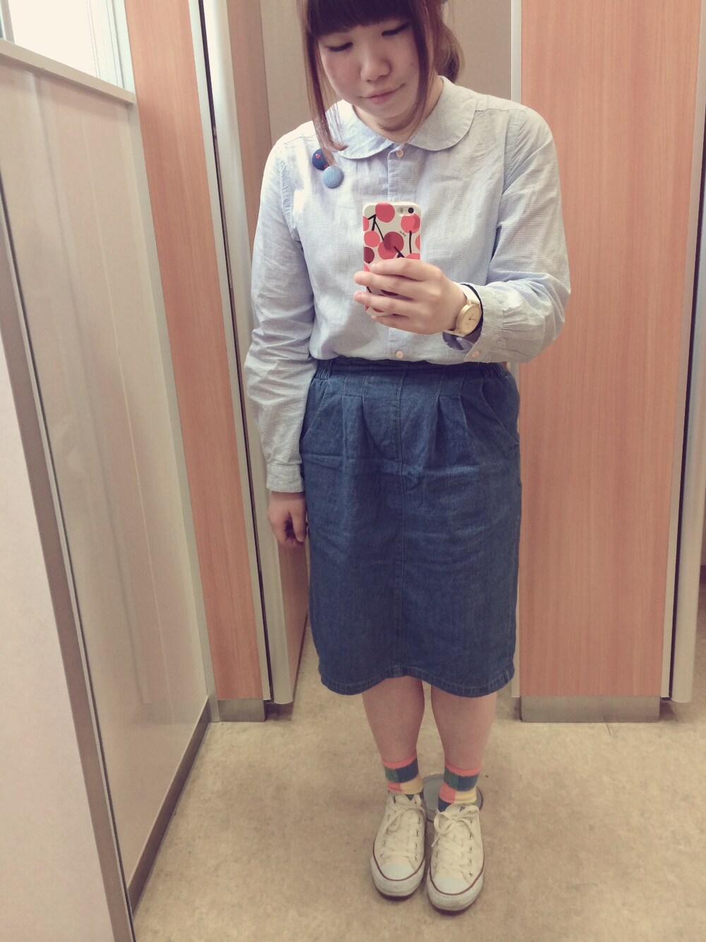 トップス:POUDOUDOU スカート:Ray Cassini 胸元のてんとう虫ブローチが お気に入りです。