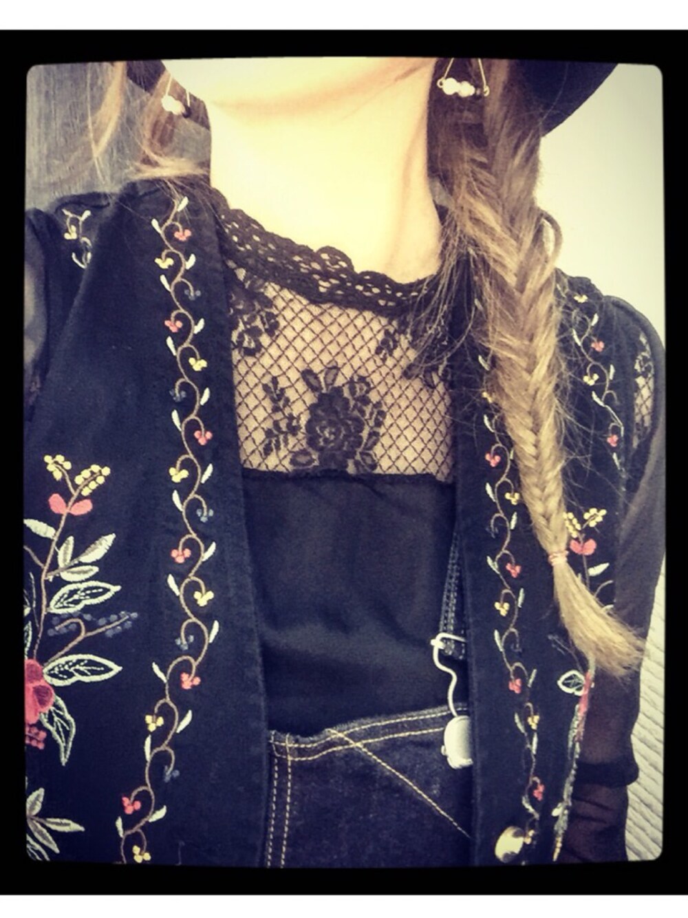 フィッシュボーンを完全にマスター☆ 古着屋さんで 激安で購入した 花柄刺繍のベスト レースの透けトップス すごくお気に入りです♡